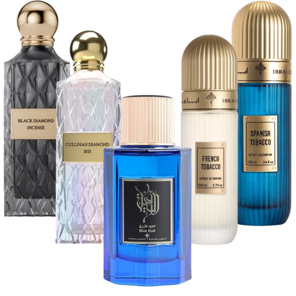 Indulge in the finest collection of fragrances with the Ibraheem AlQurashi Luxury Fragrance Decants Pack, featuring five premium scents: Black Diamond Incense, Cullinan Diamond, French Tobacco, Spanish Tobacco, and Blue Oud. This exclusive set offers a curated selection of exquisite perfumes and incense, each crafted to provide a unique and unforgettable experience. Perfect for those who want to experience luxury, these decants give you the opportunity to try each fragrance before committing to a full bottle. Whether you're looking for deep, smoky notes with Black Diamond Incense, the elegant sophistication of Cullinan Diamond, or the bold richness of French and Spanish Tobacco, this pack offers something for every fragrance lover. Ideal for gifting or as a personal treat, this luxury fragrance decants pack is a must-have for connoisseurs and those looking to elevate their scent collection. Shop the Ibraheem AlQurashi Luxury Fragrance Decants Pack at Aar Fragrances today and experience the essence of luxury in every drop. Perfect for both men and women, these decants are the gateway to discovering your signature scent. Explore now at Aar Fragrances and immerse yourself in the world of exclusive luxury fragrances.